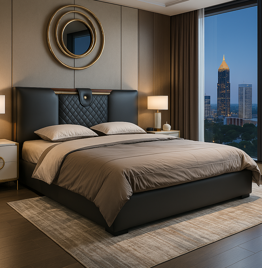 The Shadow Leather and Steel Bed Frame is where industrial strength meets refined luxury. Crafted with a sleek steel structure and upholstered in deep shadow-toned leather, this designer bed is built to be the centerpiece of any modern bedroom. Its bold silhouette and premium materials offer unmatched durability and style.