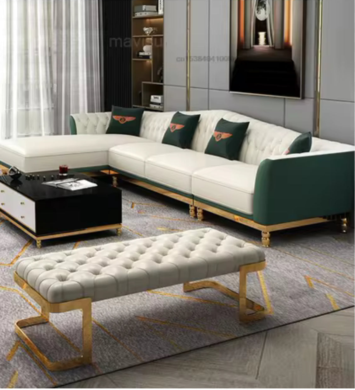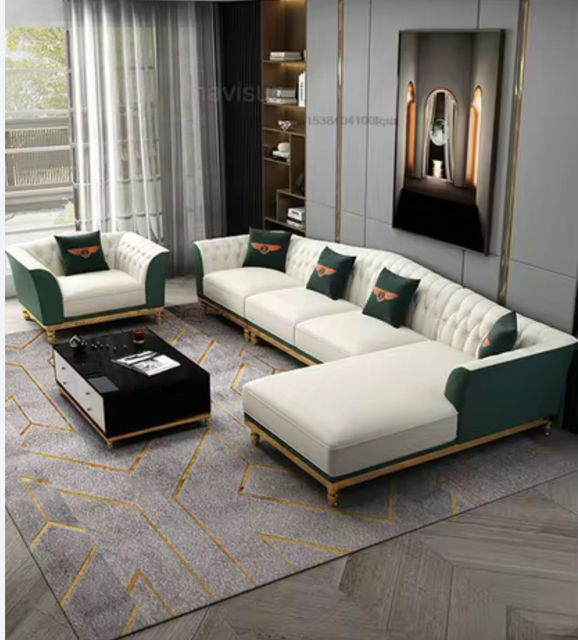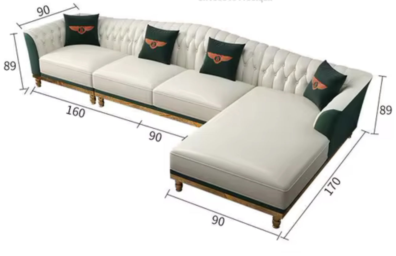 Experience luxury like never before with the GG-White & Teal Leather Sectional Sofa. Made from high-quality genuine leather, this 2-piece sectional showcases a striking teal back and a pristine white front. The gold trim legs provide a regal finish, making this sofa the epitome of sophistication in any living space. Dimensions in the pictures are in centimeters, while converted to inches below.
