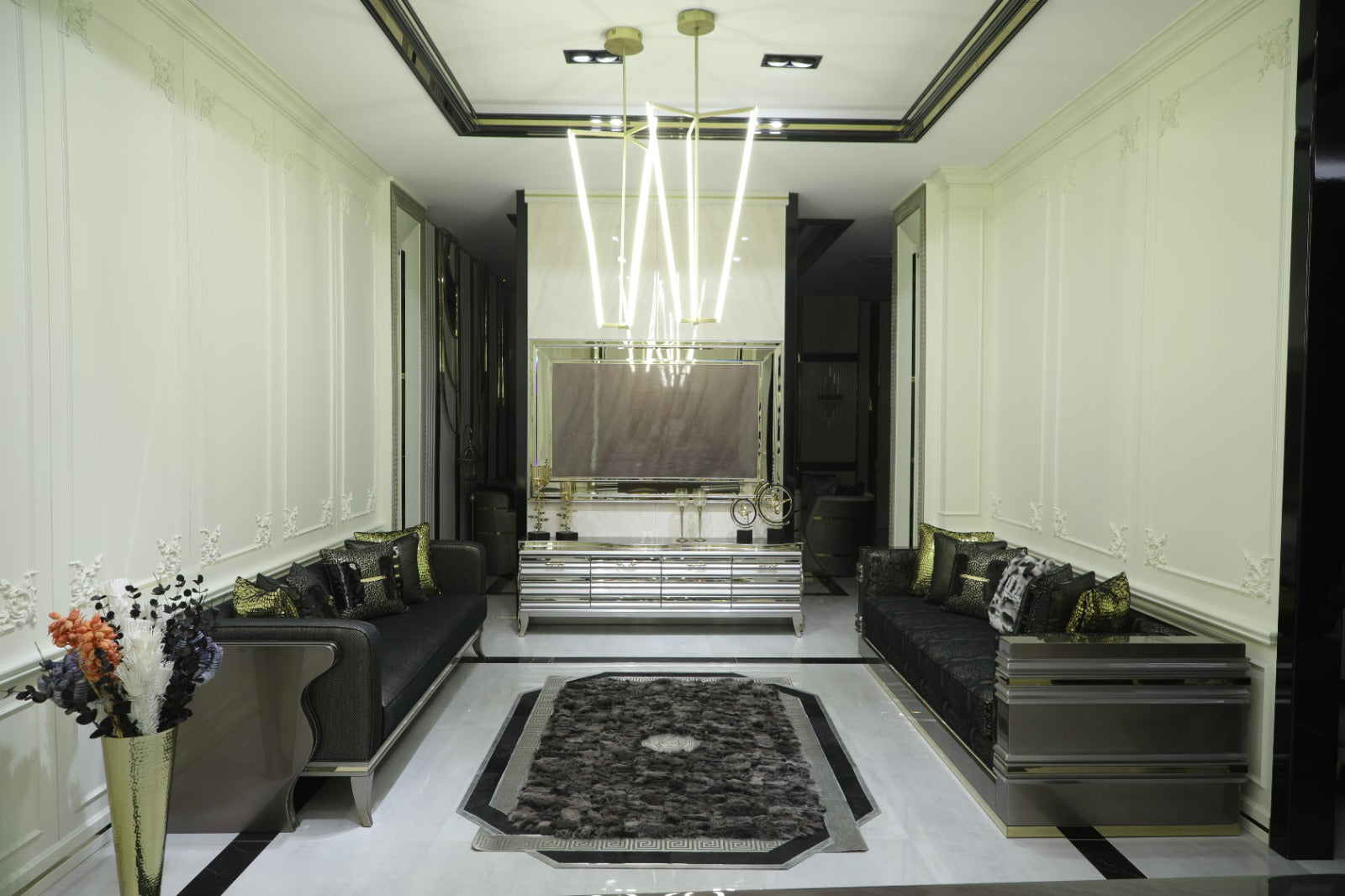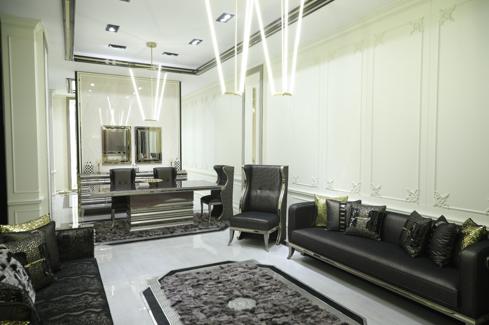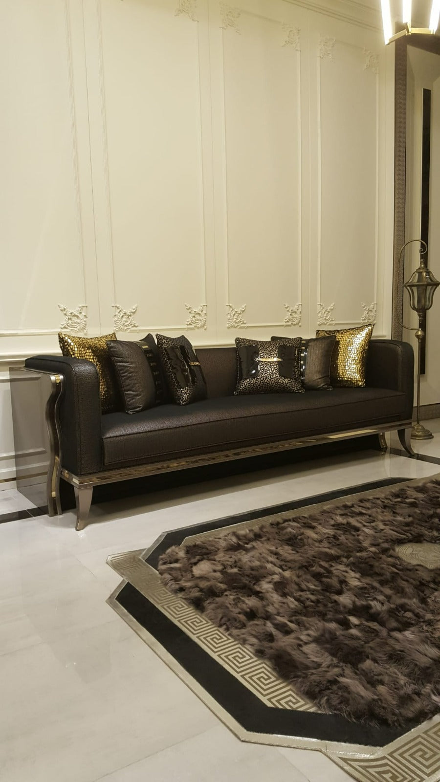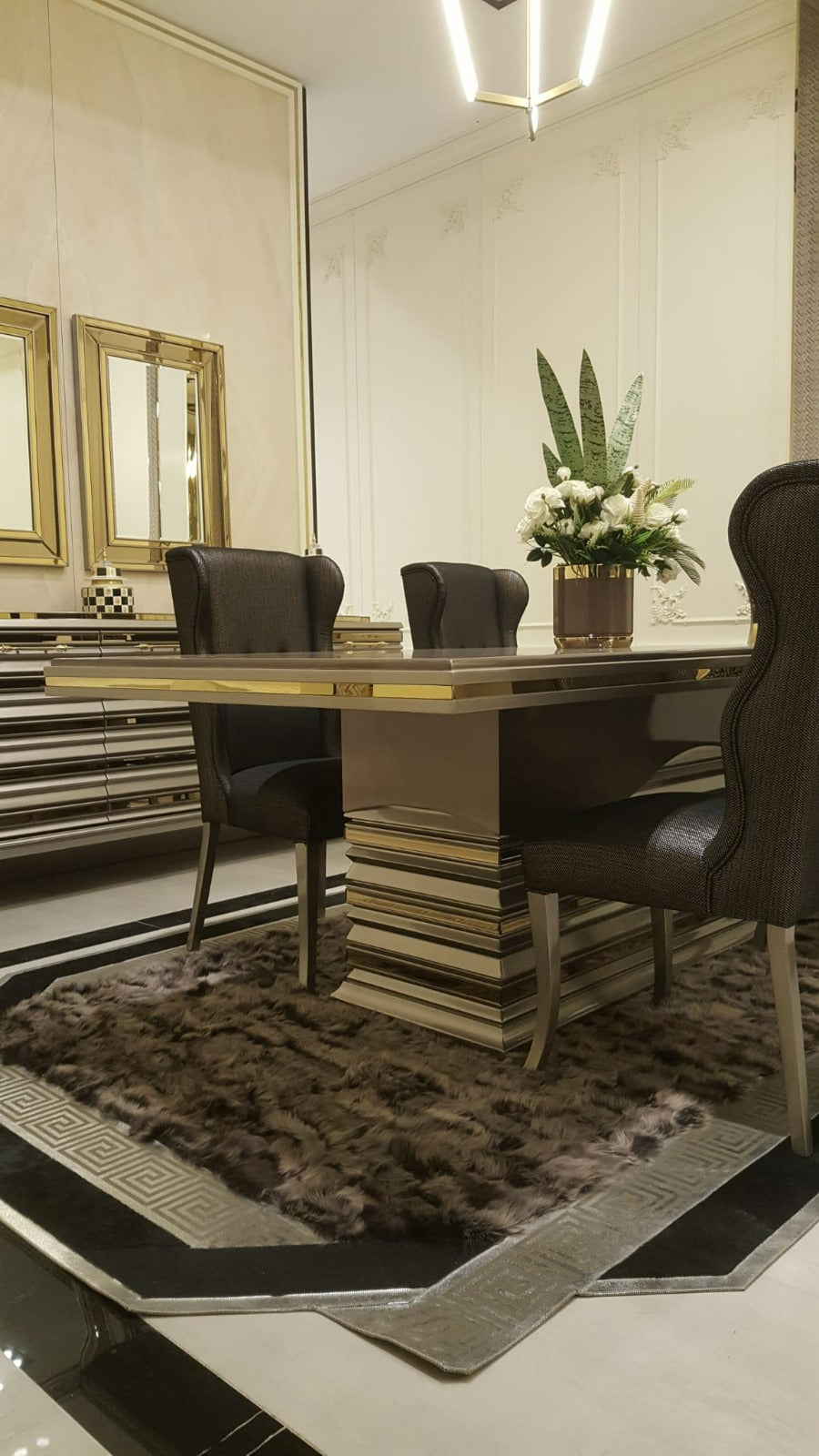 Delight in the opulence of your living space orchestrated by our G-LR Atlantis Living Room Settee. This masterpiece is a synthesis of stainless steel metal with titanium clay, giving it a modern and sleek finish. Crafted from first-class fabric and soft foam rubber, our seating offers unparalleled comfort. Notable features include decorative design cushions, and a cleanable soft fabric that ensures longevity. Emphasizing on the meticulous attention to detail is the well-crafted wood, touched with glossy special effect paint to accentuate its elegant appeal. The Settee is further characterized by a wood design realized through precision CNC techniques. The color, size, and fabric can be configured to your preference. The set embraces 2 inviting sofas, 2 armchairs, 2 stylish end tables, a coffee table, a console, 2 mirrors, a TV stand and wall unit, a dining table, and 6 elegant chairs, available in black with gold trim