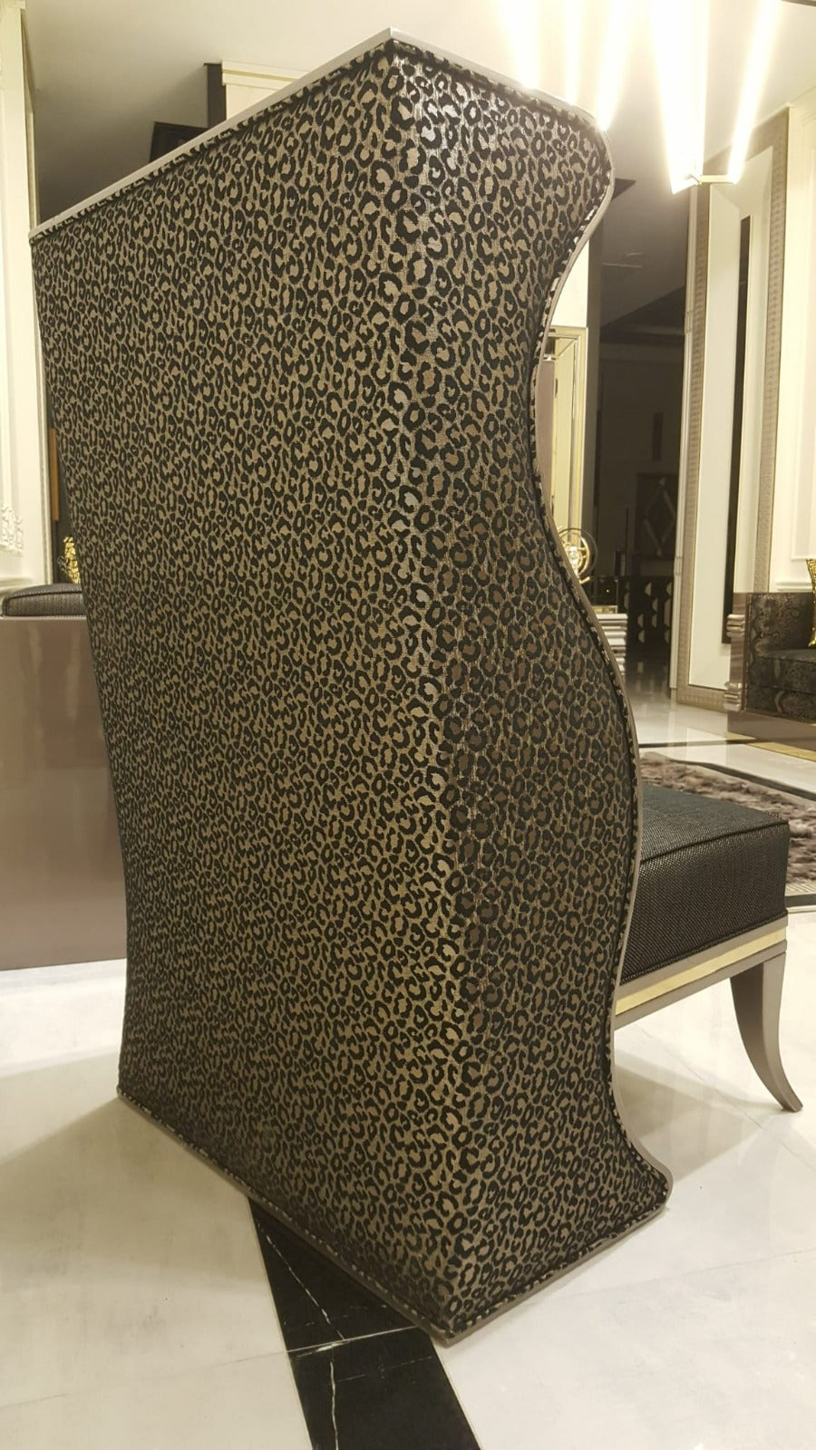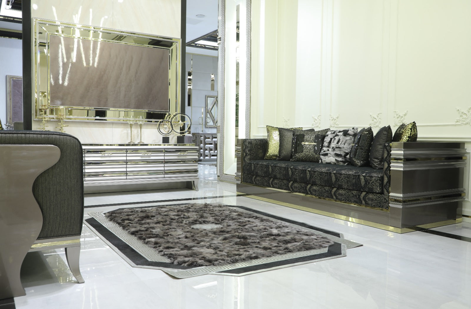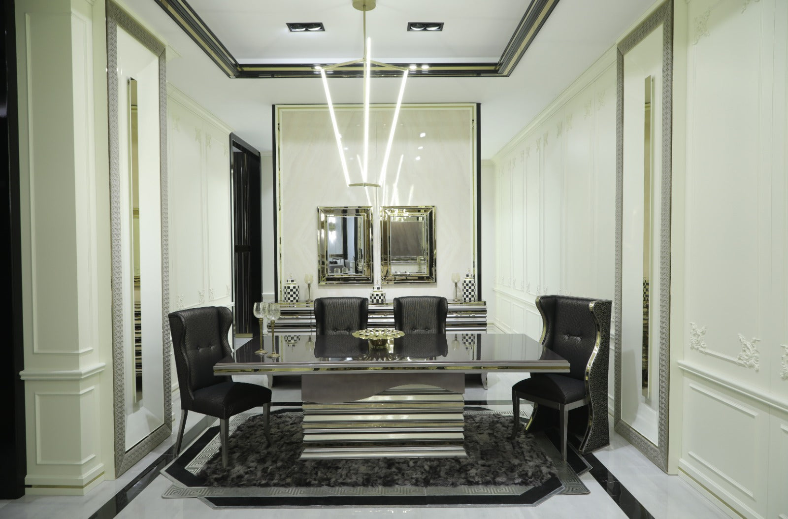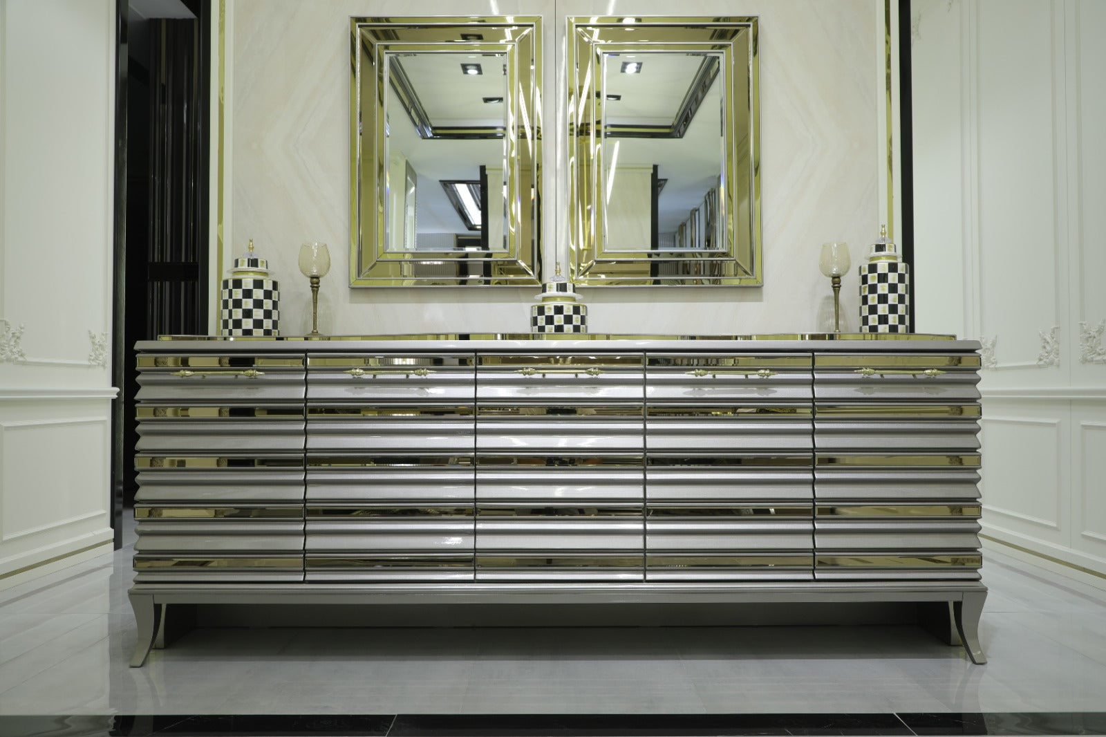 Delight in the opulence of your living space orchestrated by our G-LR Atlantis Living Room Settee. This masterpiece is a synthesis of stainless steel metal with titanium clay, giving it a modern and sleek finish. Crafted from first-class fabric and soft foam rubber, our seating offers unparalleled comfort. Notable features include decorative design cushions, and a cleanable soft fabric that ensures longevity. Emphasizing on the meticulous attention to detail is the well-crafted wood, touched with glossy special effect paint to accentuate its elegant appeal. The Settee is further characterized by a wood design realized through precision CNC techniques. The color, size, and fabric can be configured to your preference. The set embraces 2 inviting sofas, 2 armchairs, 2 stylish end tables, a coffee table, a console, 2 mirrors, a TV stand and wall unit, a dining table, and 6 elegant chairs, available in black with gold trim