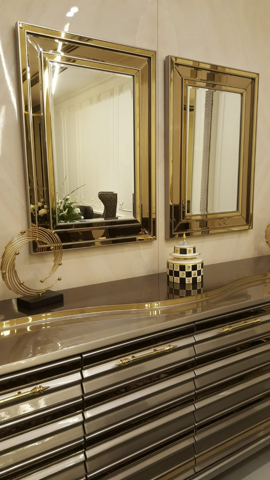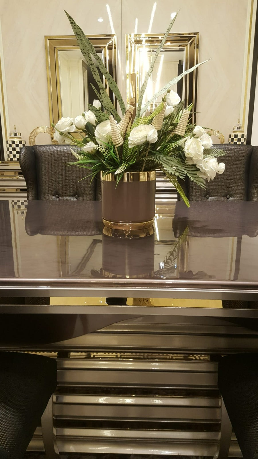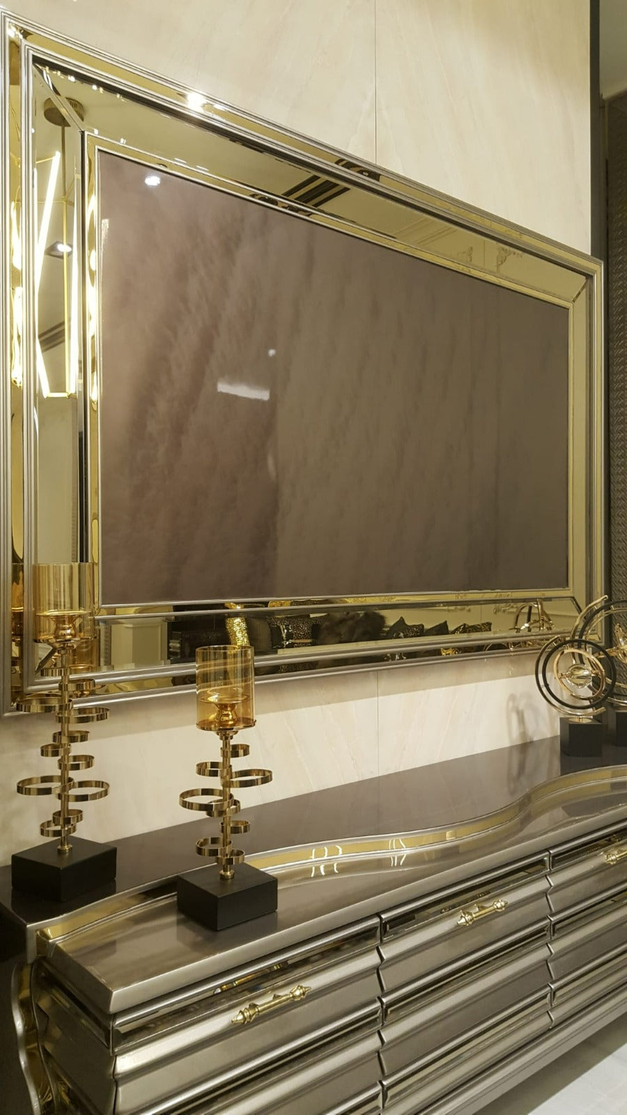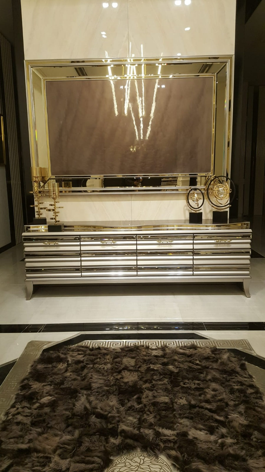 Delight in the opulence of your living space orchestrated by our G-LR Atlantis Living Room Settee. This masterpiece is a synthesis of stainless steel metal with titanium clay, giving it a modern and sleek finish. Crafted from first-class fabric and soft foam rubber, our seating offers unparalleled comfort. Notable features include decorative design cushions, and a cleanable soft fabric that ensures longevity. Emphasizing on the meticulous attention to detail is the well-crafted wood, touched with glossy special effect paint to accentuate its elegant appeal. The Settee is further characterized by a wood design realized through precision CNC techniques. The color, size, and fabric can be configured to your preference. The set embraces 2 inviting sofas, 2 armchairs, 2 stylish end tables, a coffee table, a console, 2 mirrors, a TV stand and wall unit, a dining table, and 6 elegant chairs, available in black with gold trim