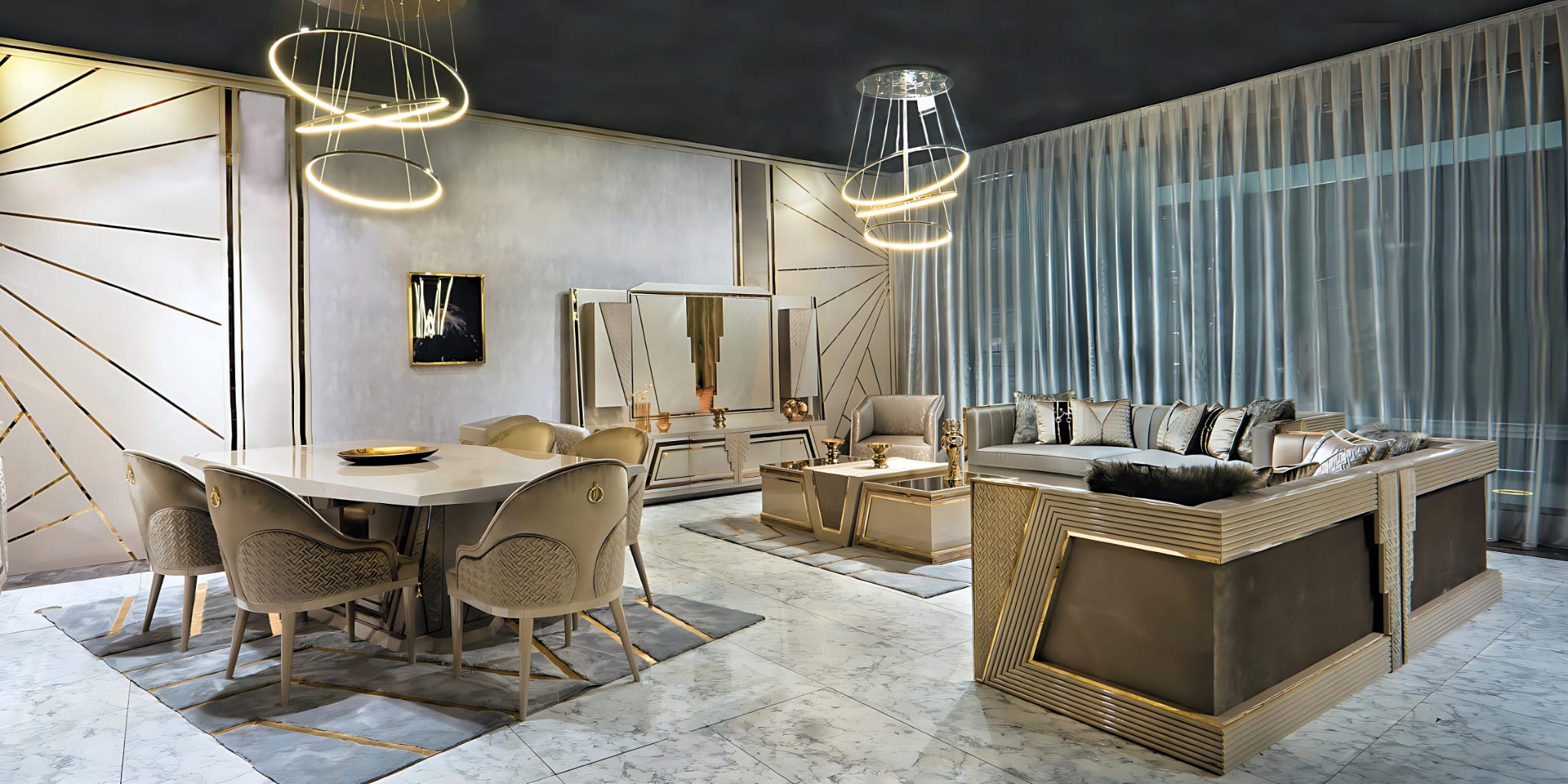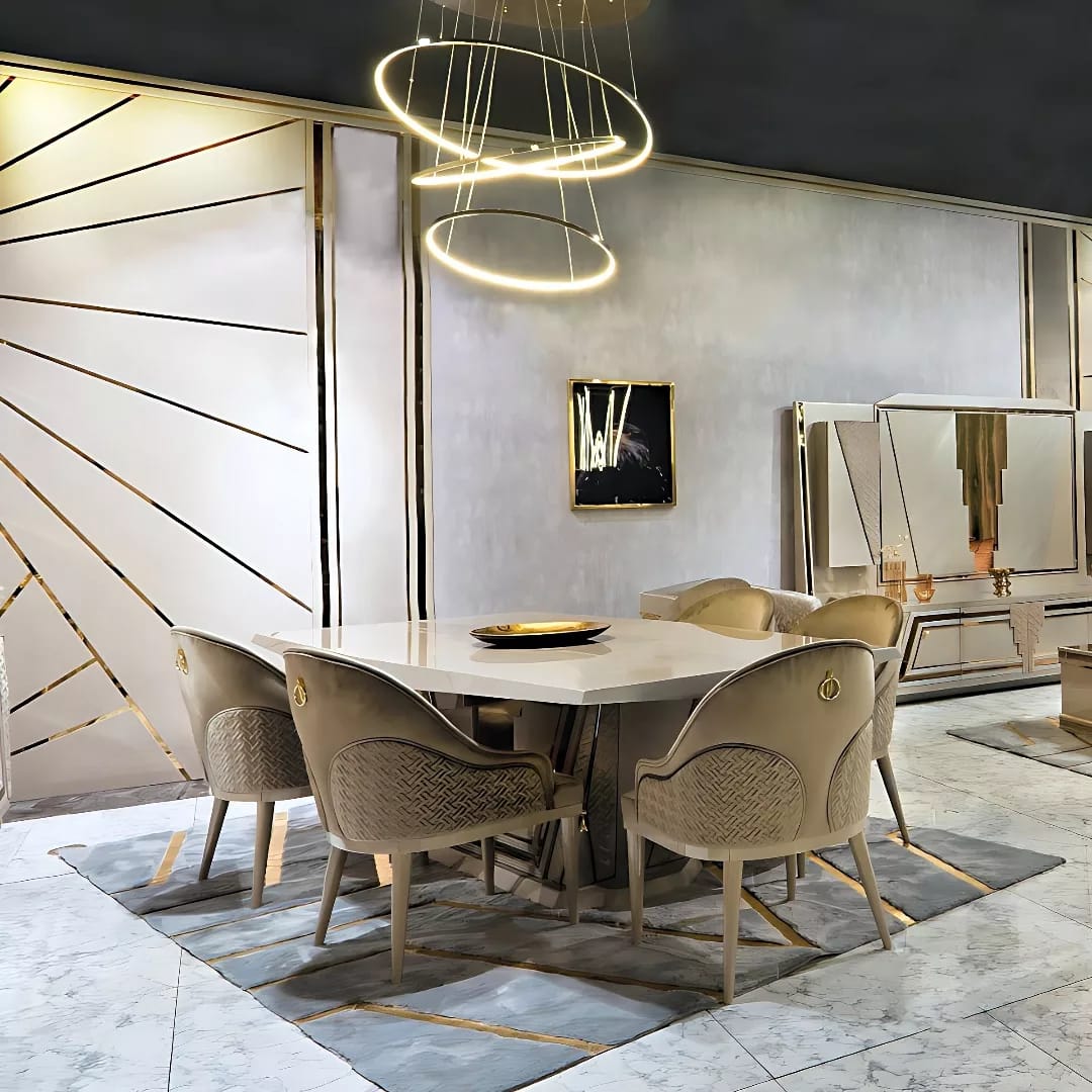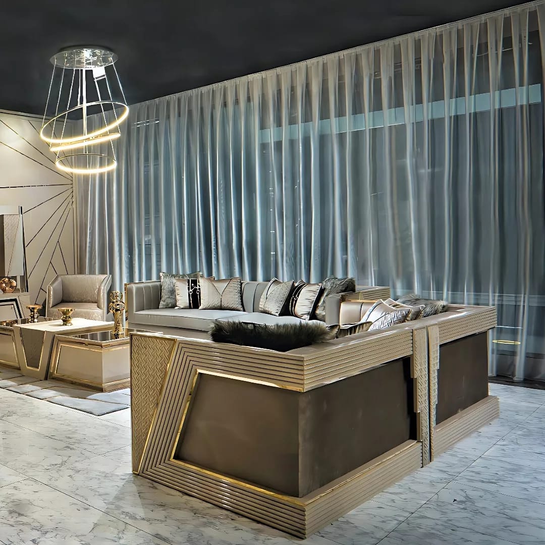 “The G-LS Glory Living Room Settee offers a distinct blend of opulence and comfort. Fashioned out of well-crafted wood, coated with glossy special effect paint and detailed with unique wood design through advanced CNC technology. The settee’s external fabric color is a rich cream mixed with champagne beige. This first-class fabric doesn’t only display elegance but also ensures durability. It is accompanied by a decorative design cushion collection, filled with soft foam rubber for added comfort. The frame is constructed using resilient stainless steel metal mixed with titanium clay, lending further dignity to this luxury set. Furthermore, the sofa set’s fabric is effortlessly cleanable ensuring your suite remains stunning for years to come. However, the color, size, and fabric can be customized to cater to your desired aesthetic. The complete room set includes 2 plush sofas, 2 armchairs, 2 elegant end tables, a coffee table, a console and 2 mirrors, a TV stand, wall unit, dining table, and 6 chairs.”