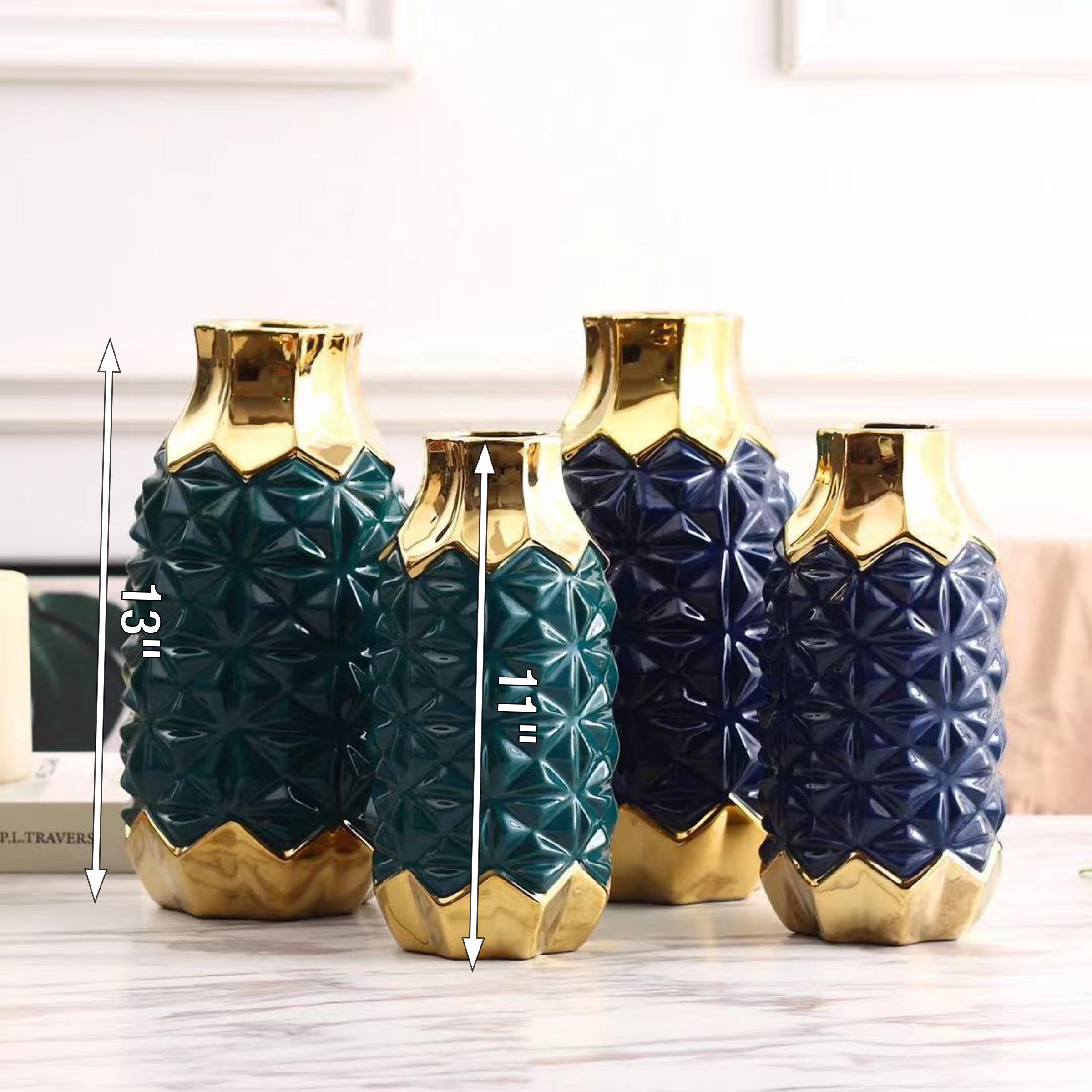 The G-VDJ 2-1 Green and Gold Decorative Jar Set breathes life into your space with its captivating blend of green and gold. Crafted from high-quality ceramic mud, these jars are not only a sight to behold but also durable and long-lasting. Whether you want to display them empty or fill them with small trinkets, these jars will add a touch of sophistication and elegance to any corner of your home. Bring the beauty of nature indoors with this exquisite Green and Gold Decorative Jar Set!