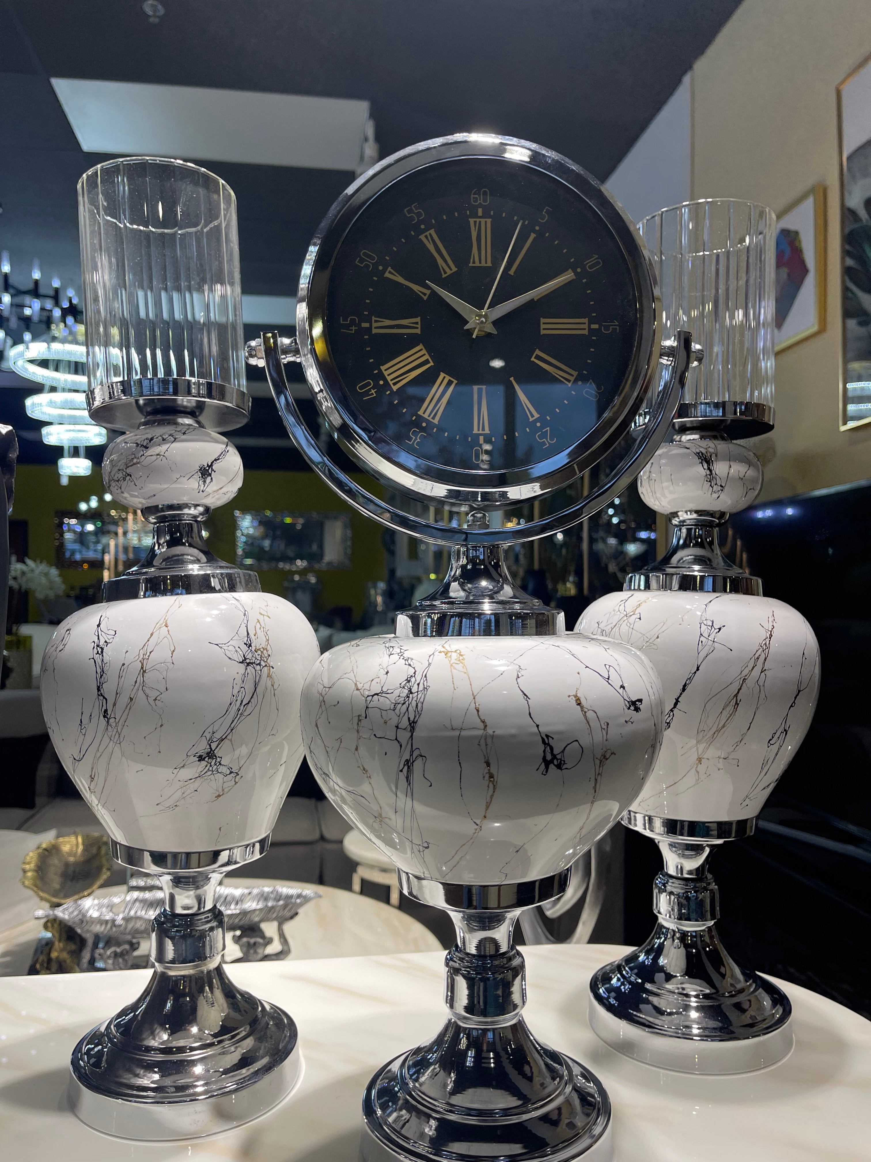 Experience Restricted Grandeur with G-VJSER01 3-1 White/Silver Decorative Jar Set – Why settle for less when you can embellish your home with the ultimate luxury. Our G-VJSER01 3-1 White/Silver Decorative Jar Set, expertly crafted from superior steel, presents a majestic blend of sophistication and flair. Each jar in the 3piece set is adorned with an exclusively designed Clock Crown Lid that imparts an aristocratic touch. Infuse your home decor with the elegance of this stunning jar set, that is as versatile as it is opulent. The sterling Silver Base Steel compliments the sleek white jar, making it a versatile piece that suits any decor.