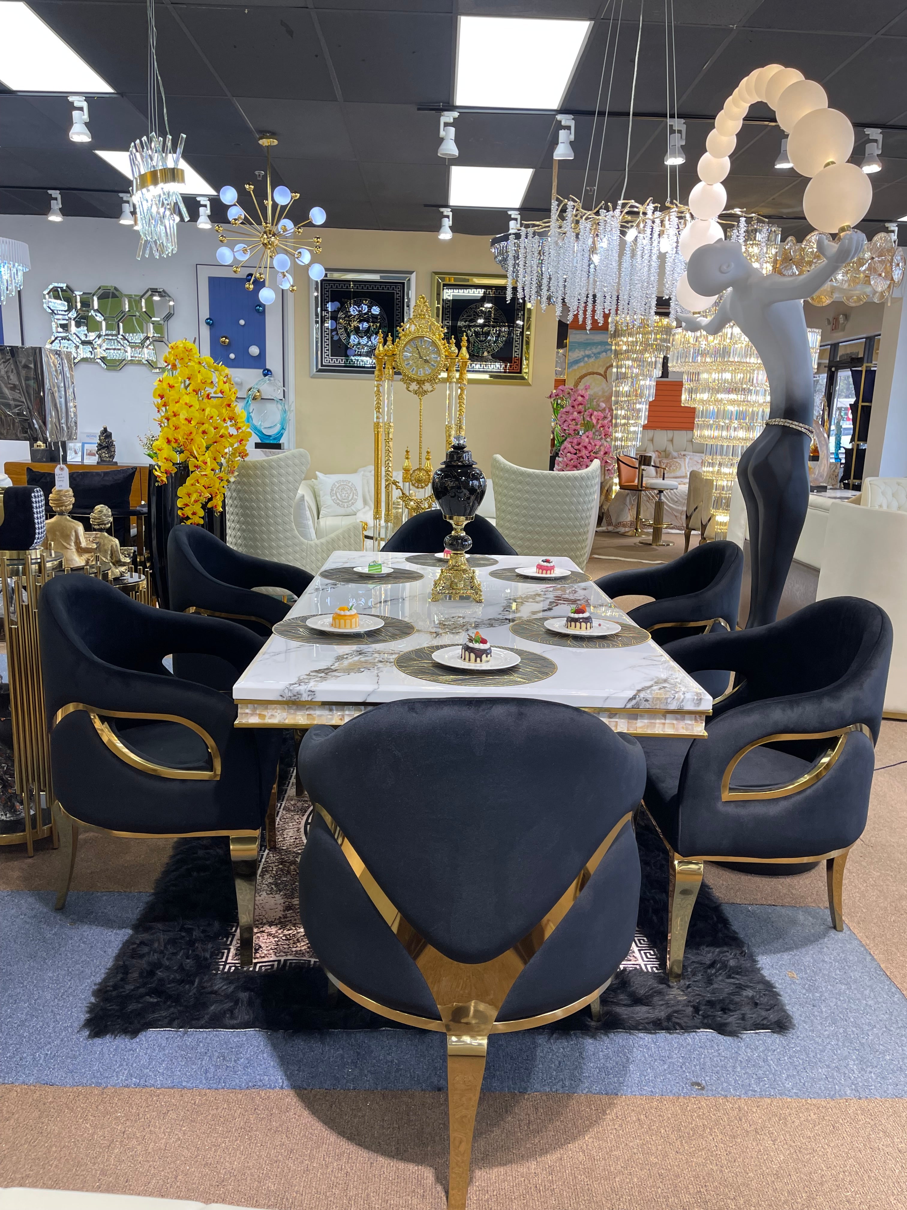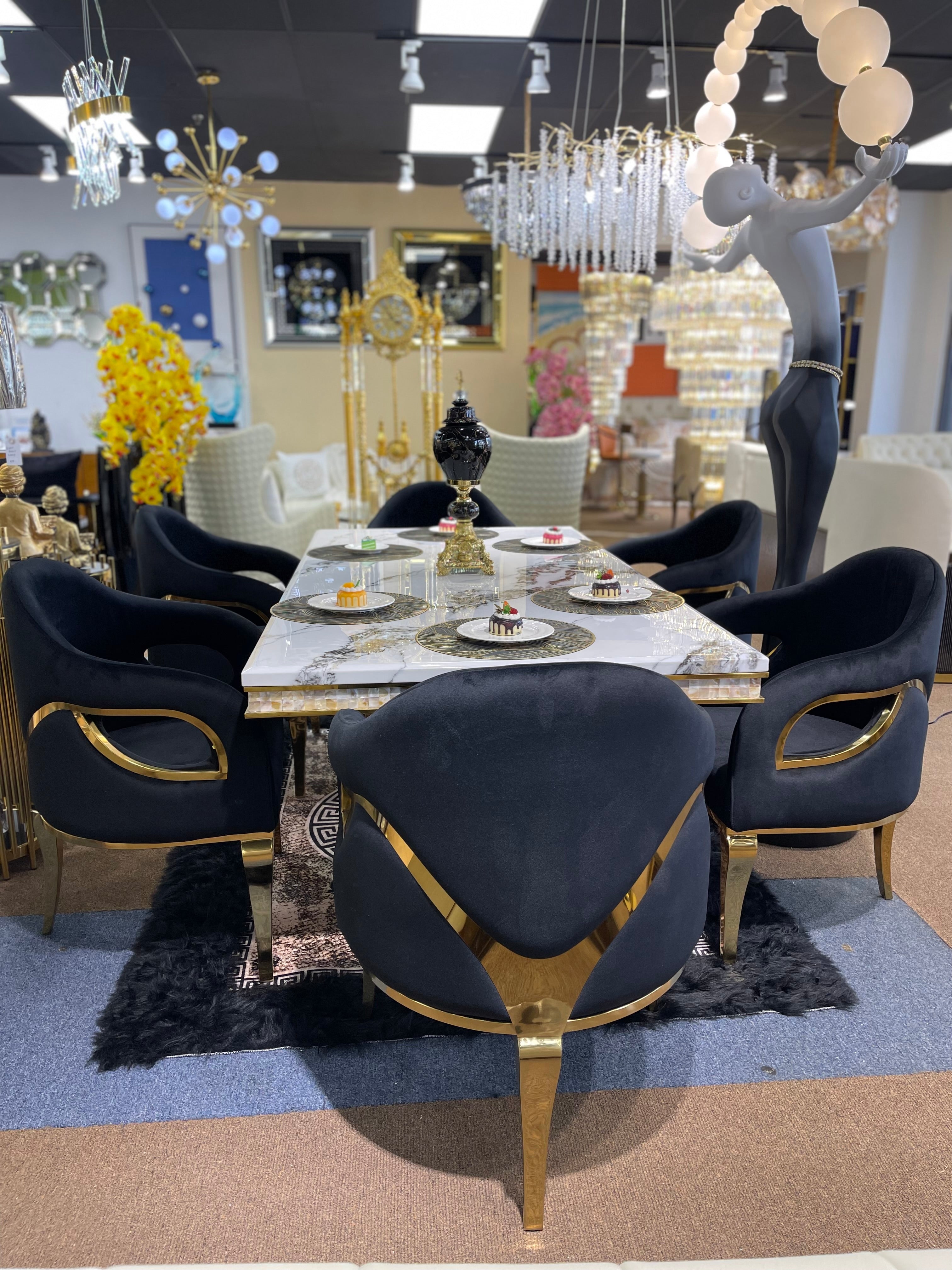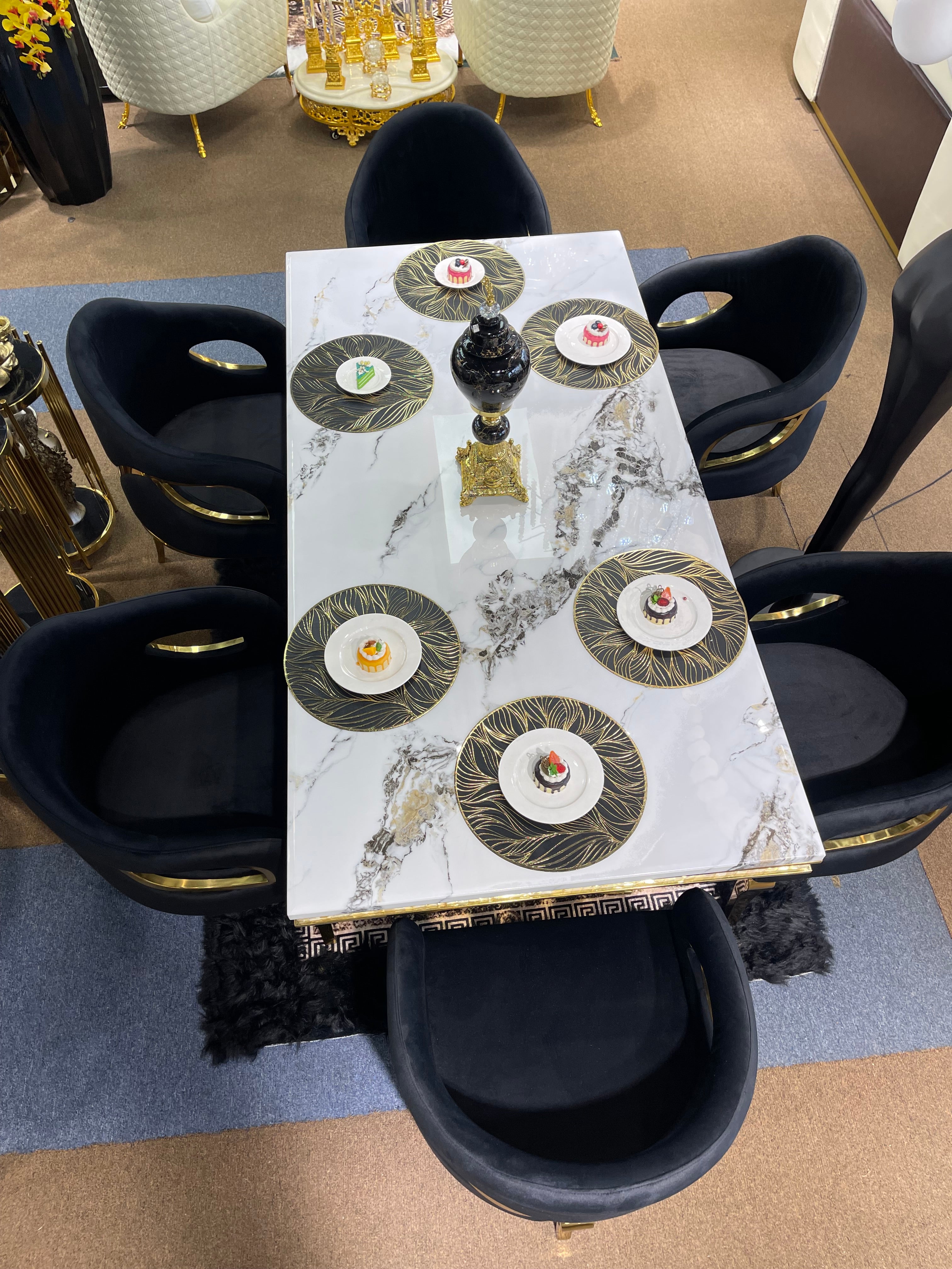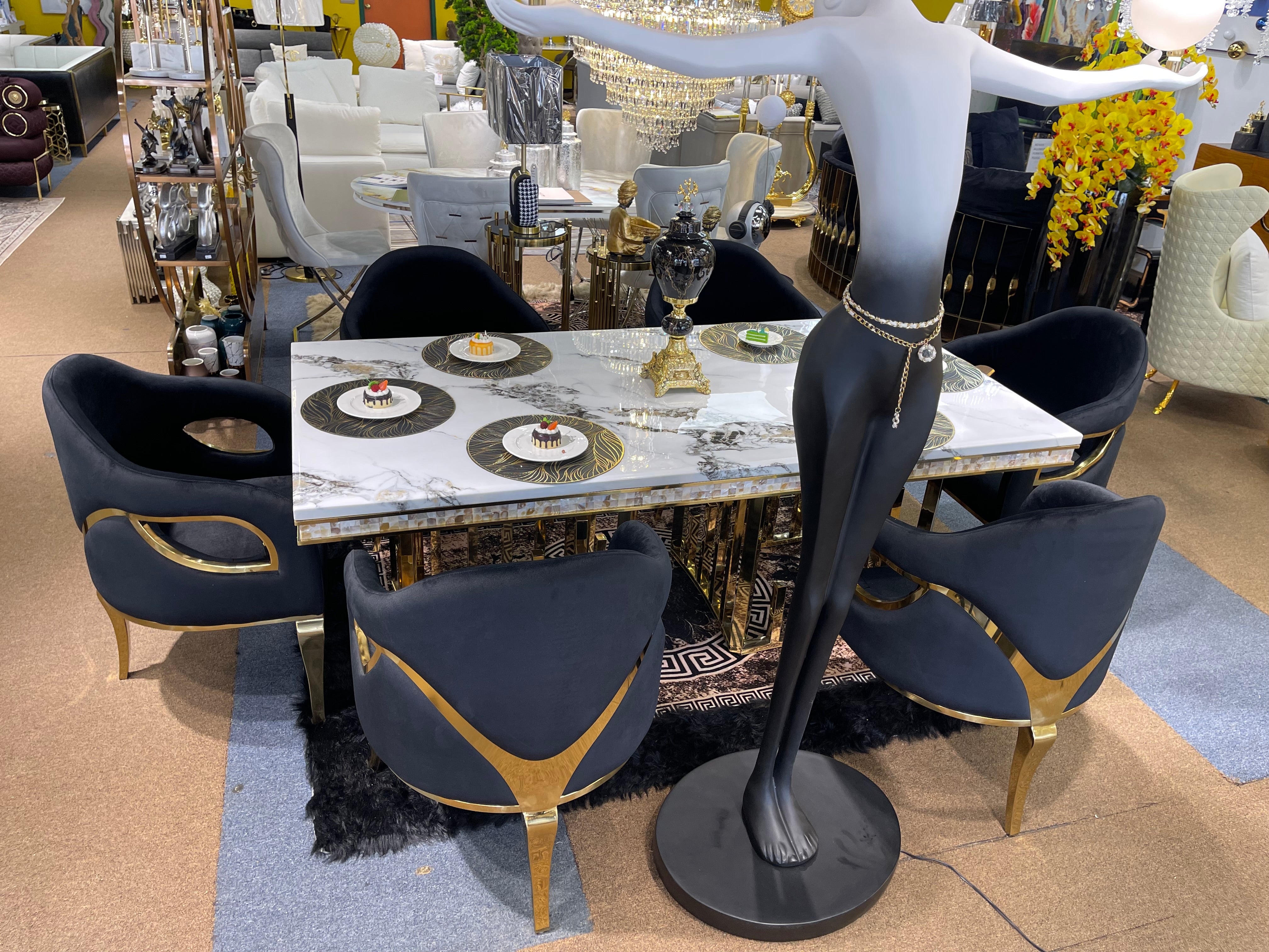 Make a statement in your dining room with our GGD-White Modern Marble Dining Table & Black Chair Settee. The modern dining table features a sleek marble top and a titanium gold base, giving it a luxurious and contemporary look. The set includes 6 black fabric chairs that are both chic and cozy for long dinner parties or casual meals. With stain-resistant materials like velvet and suedes, this set is not only elegant but also easy to clean. Treat yourself to the ultimate dining experience with this Mercedes Benz dining table with gold trim detail and dimensions of 79 inches by 40 inches.