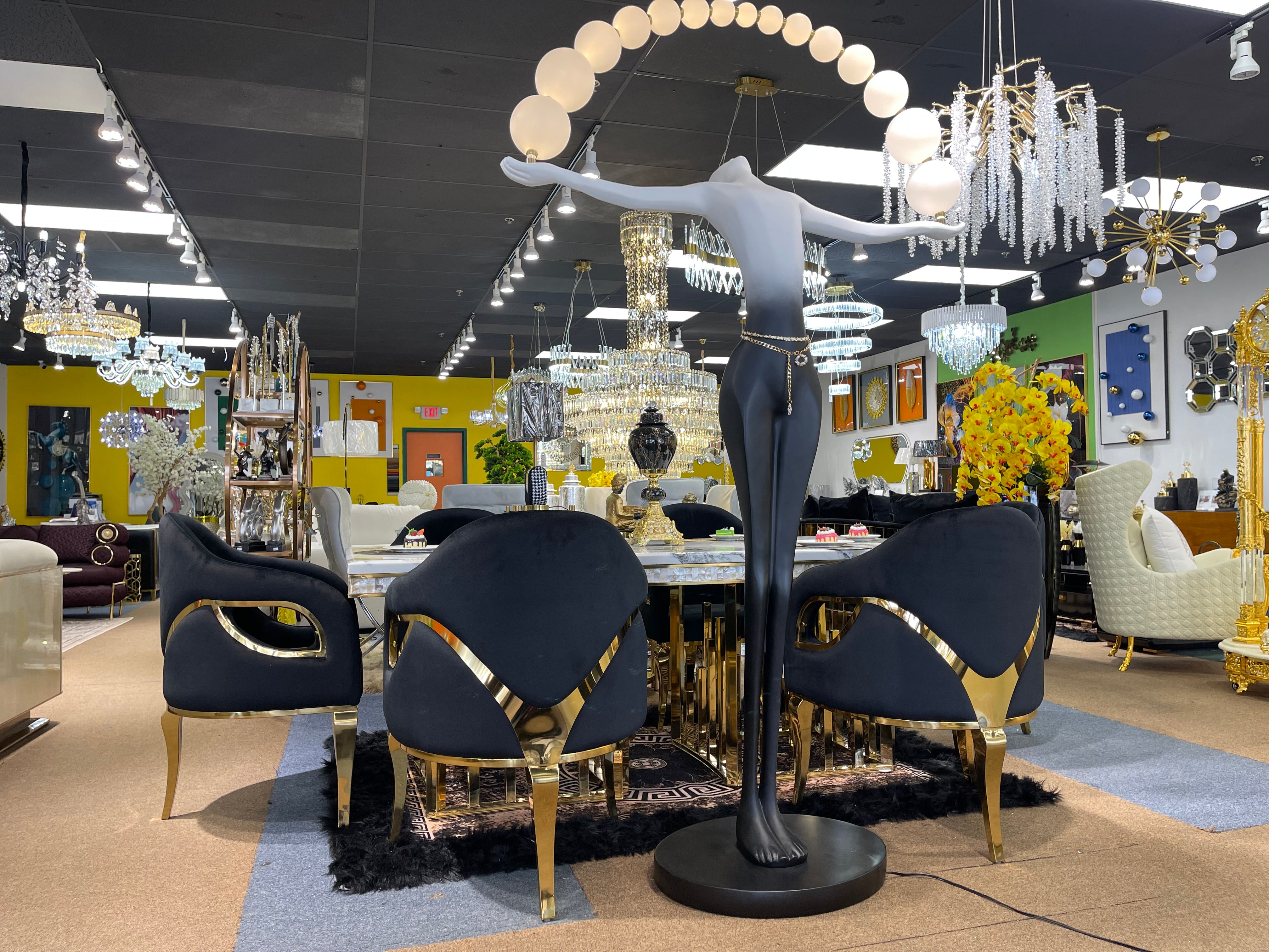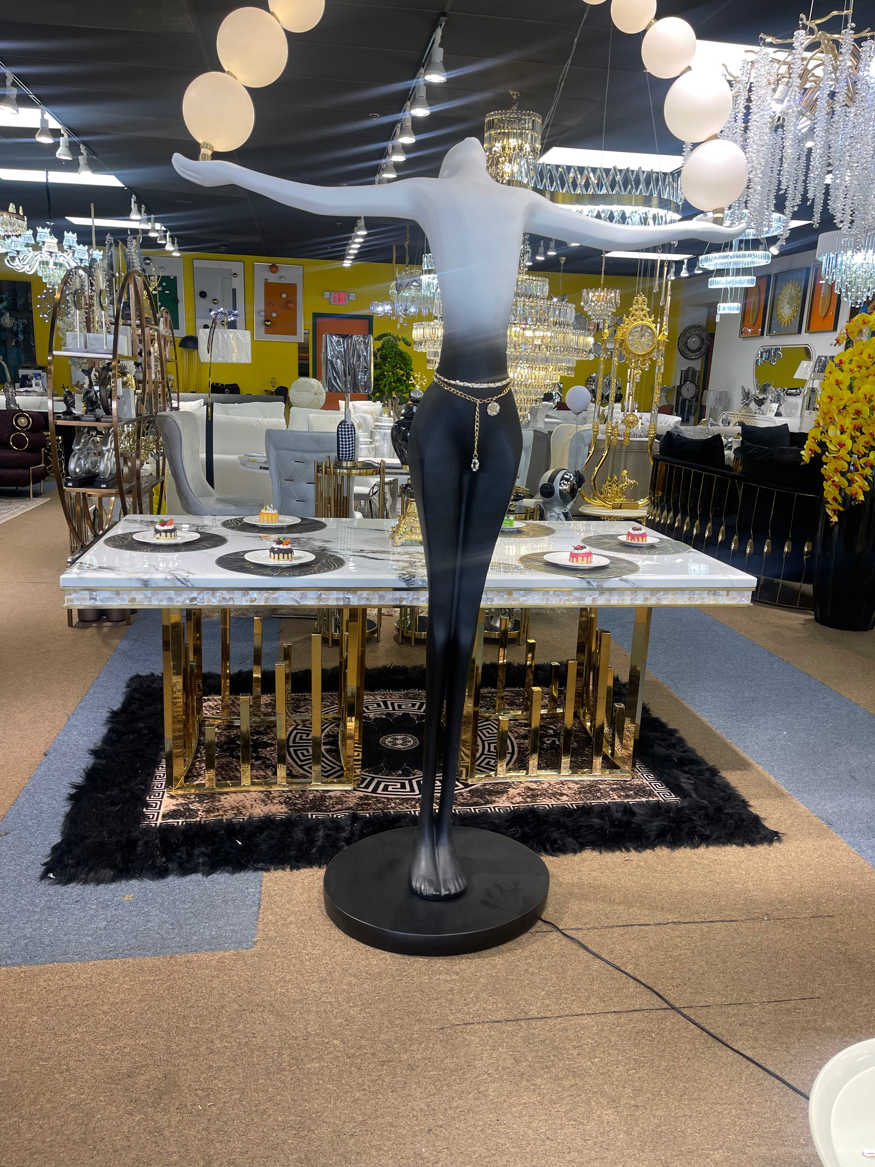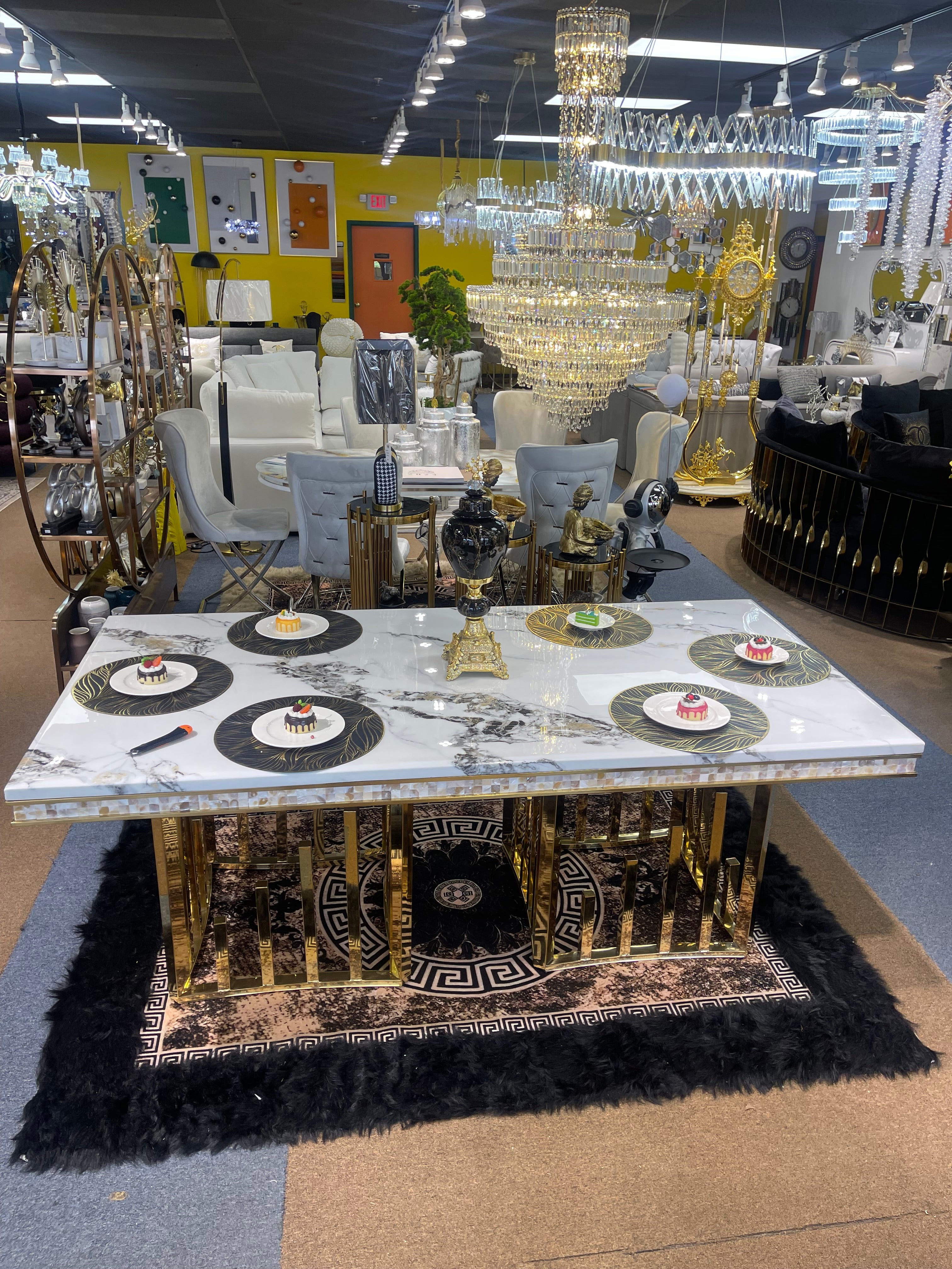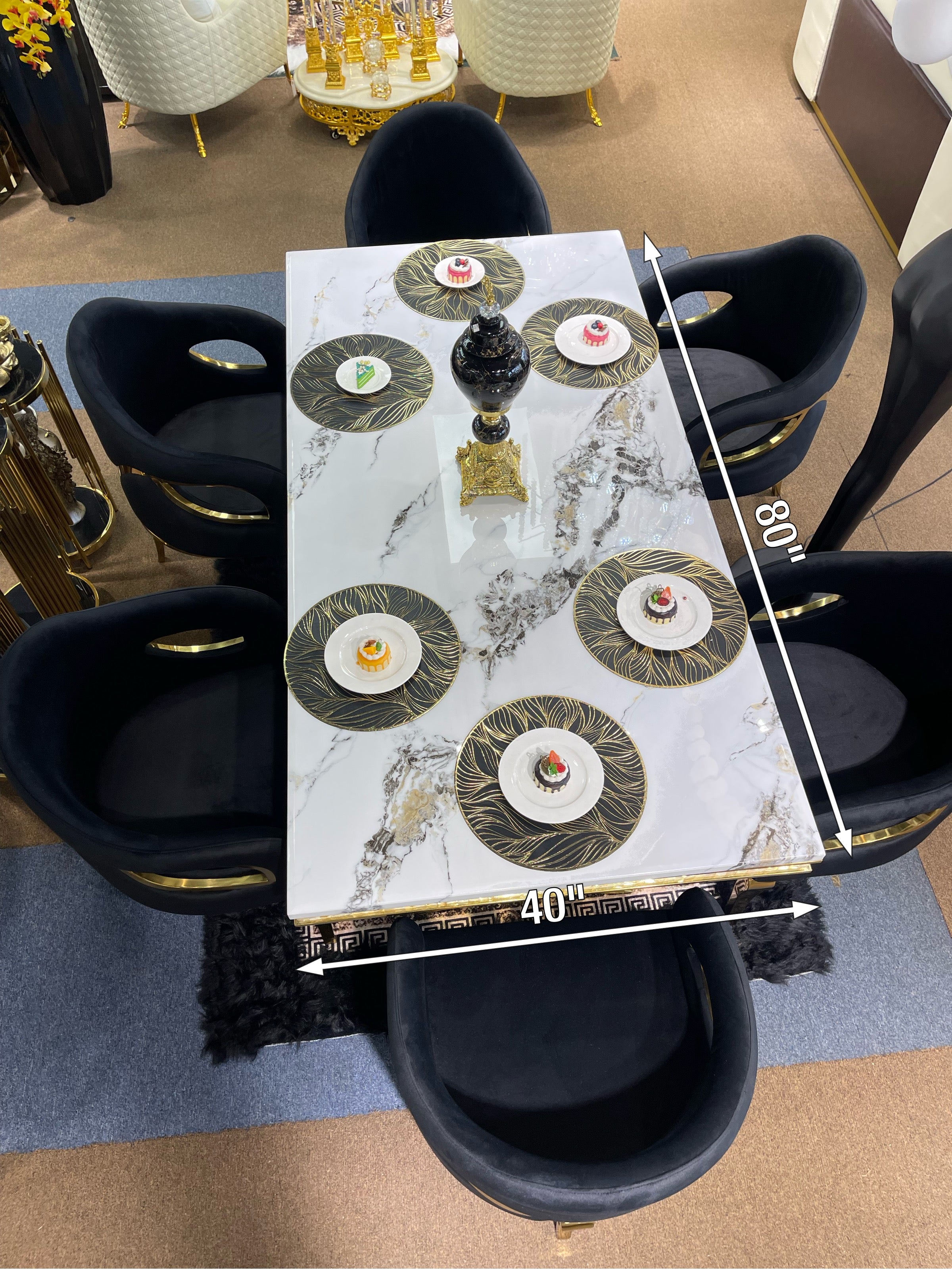 Make a statement in your dining room with our GGD-White Modern Marble Dining Table & Black Chair Settee. The modern dining table features a sleek marble top and a titanium gold base, giving it a luxurious and contemporary look. The set includes 6 black fabric chairs that are both chic and cozy for long dinner parties or casual meals. With stain-resistant materials like velvet and suedes, this set is not only elegant but also easy to clean. Treat yourself to the ultimate dining experience with this Mercedes Benz dining table with gold trim detail and dimensions of 79 inches by 40 inches.