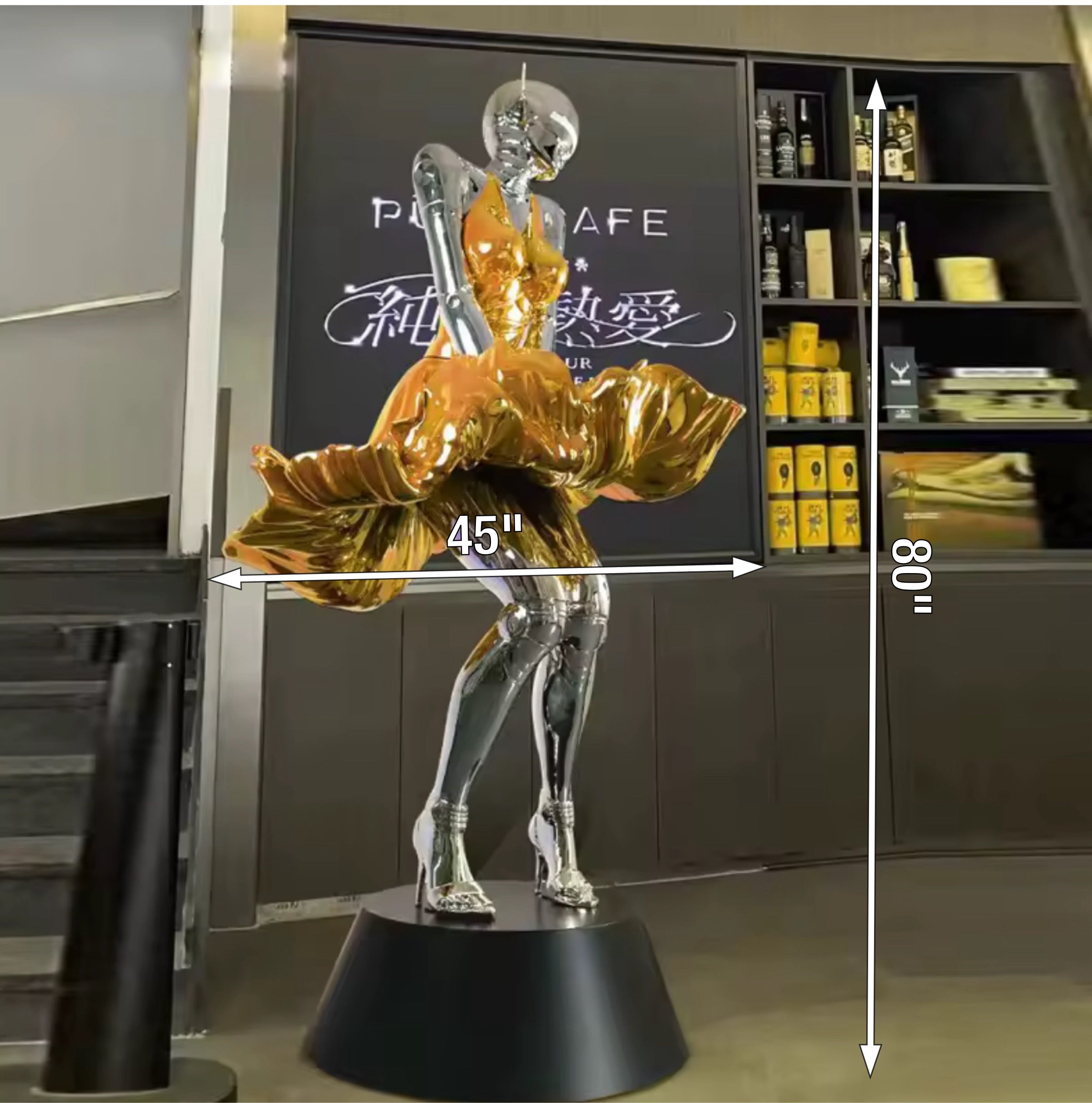 Transform your space into a work of art with the GS Gold & Silver Exotic Futuristic Marvel LED female Sculpture. Standing tall at 80 inches and measuring 45 inches in length, this striking piece features mesmerizing LED lights in the eyes, illuminating the room with a soft, enchanting glow. Crafted from premium resin and fiberglass, adorned in a radiant gold dress, this sculpture embodies luxury and elegance, making it a must-have for any sophisticated decor.