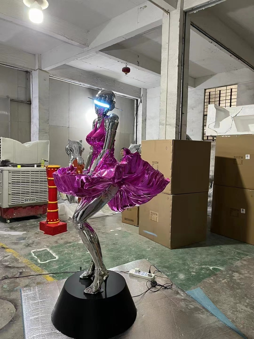 Elevate your living space with the exquisite GS pink & Silver Exotic Futuristic Marvel LED female Sculpture. Standing tall at 80 inches in height and 45 inches in length, this stunning piece features captivating LED lights within the eyes, adding a mesmerizing glow to any room. Crafted from high-quality resin and fiberglass, adorned in a shimmering gold dress, this sculpture exudes luxury and sophistication.